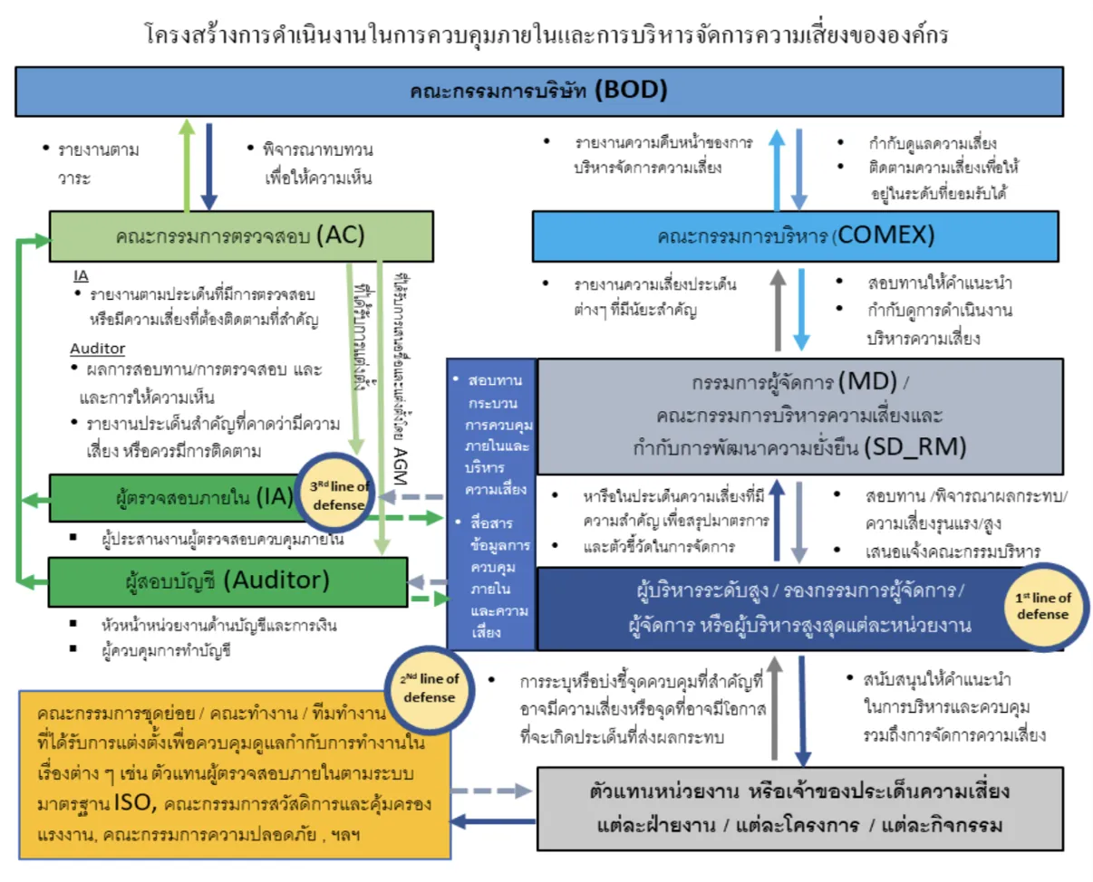 โครงสร้างการควบคุมภายในและการบริหารความเสี่ยงขององค์กร ประกอบด้วย คณะกรรมการบริษัทอนุมัติกรอบนโยบายควบคุมภายในและการบริหารจัดการด้านความเสี่ยงรวมถึงมีการแต่งตั้งคณะกรรมการชุดย่อยต่างๆ เพื่อทำหน้าที่ในการกำกับดูแลรวมถึงสอบทานการดำเนินธุรกิจขององค์กรซึ่งคณะกรรมการชุดย่อยจะมีการปฏิบัติหน้าที่ไปตามกฎบัตรและความรับผิดชอบ สำหรับการดูแลกำกับด้านการควบคุมภายใน คณะกรรมการได้มีการแต่งตั้งคณะกรรมการบริหารความเสี่ยงและกำกับการพัฒนาความยั่งยืน (Risk Management and Sustainability Development Committee : (RM_SD). เพื่อทำหน้าที่กำกับดูแลและควบคุมการดำเนินการเพื่อให้มีการบริหารจัดการด้านความเสี่ยงและกำกับดูแลด้านการพัฒนาความยั่งยืนขององค์กร และดูแลการดำเนินการตามกระบวนการในระดับฝ่ายงานเพื่อจัดการและควบคุมความเสี่ยงเกี่ยวกับโครงสร้างพื้นฐานที่สำคัญในแต่ละสายงาน และกำกับดูแลหน่วยงานปฏิบัติการเพื่อให้มีการปฏิบัติหน้าที่ตามความรับผิดชอบเพื่อให้เป็นไปตามข้อกำหนด คู่มือ มาตรฐานการปฏิบัติ ระเบียบ วิธีการ รวมถึงเป็นไปตามกฎหมาย ข้อบังคับอย่างครบถ้วนถูกต้อง