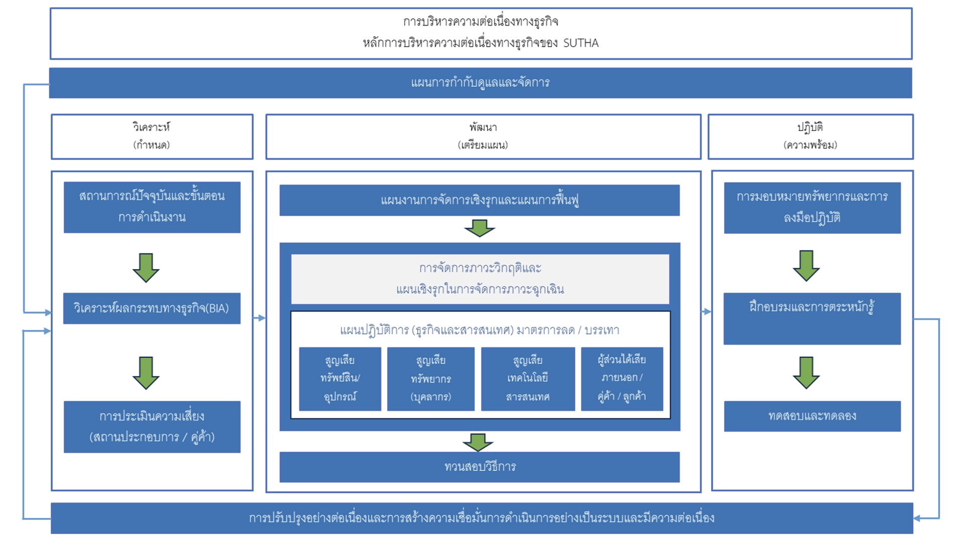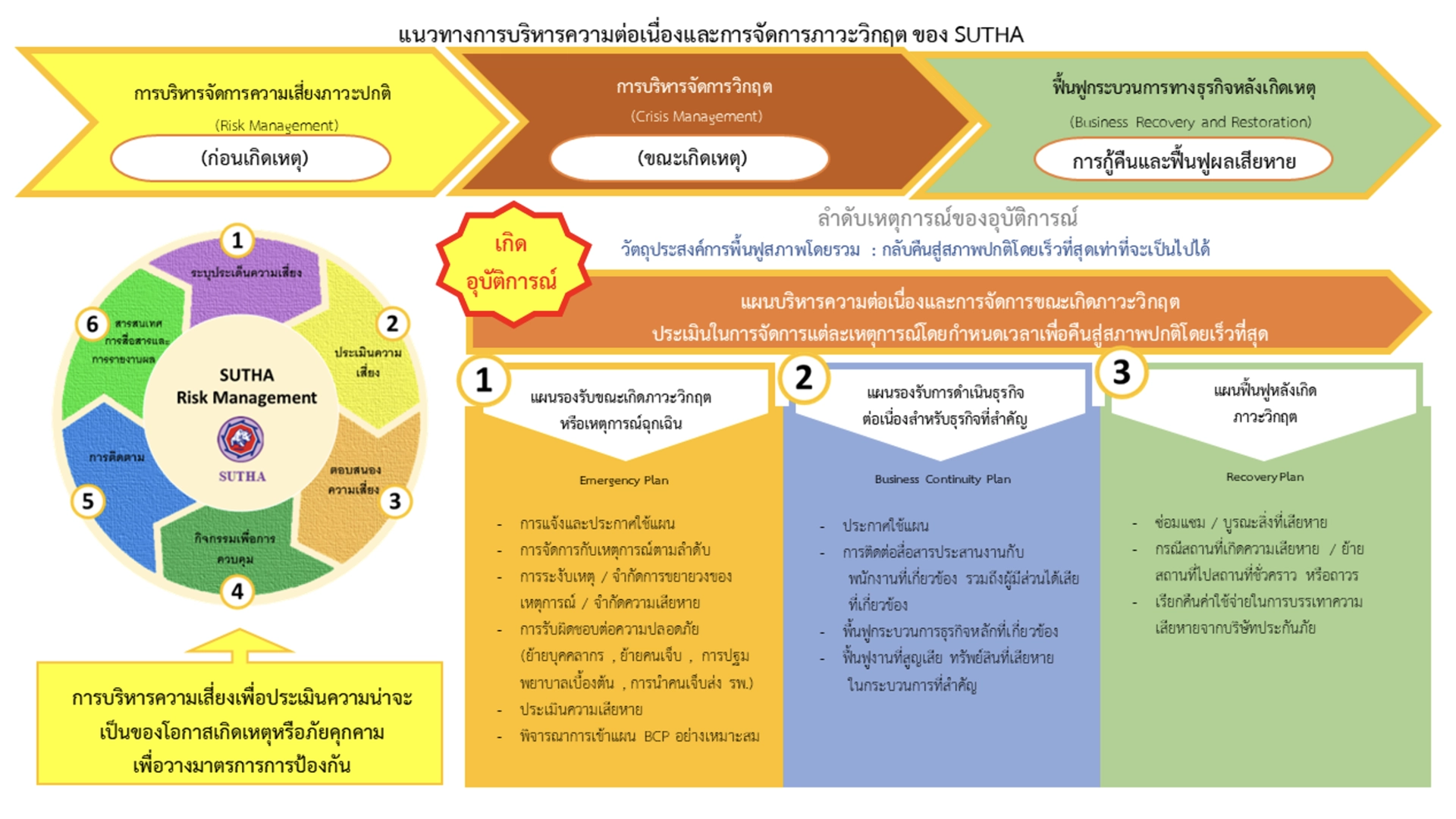 SUTHA มีการกำกับดูแลกิจการให้สอดคล้องตามกรอบแนวทางด้านความยั่งยืน โดยพัฒนากระบวนการบริหารจัดการเพื่อให้มีการดำเนินการให้กิจกรรมทางธุรกิจเป็นไปอย่างต่อเนื่อง โดยมีการบริหารจัดการความเสี่ยง การวางแนวทางเตรียมรับเหตุการณ์ฉุกเฉิน การเตรียมแผนงาน หรือมาตรการป้องกันผลกระทบที่อาจส่งผลต่อความเสียหายต่อทรัพย์สินและอุปกรณ์ ระบบเทคโนโลยี หรือระบบสารสนเทศที่สำคัญ เพื่อรักษาผลประโยชน์ของผู้มีส่วนได้เสีย ปกป้องและรักษาชื่อเสียง และสร้างให้เกิดความเชื่อมั่นต่อระบบการกำกับดูแลกิจการเพื่อให้ธุรกิจเติบโตอย่างยั่งยืน